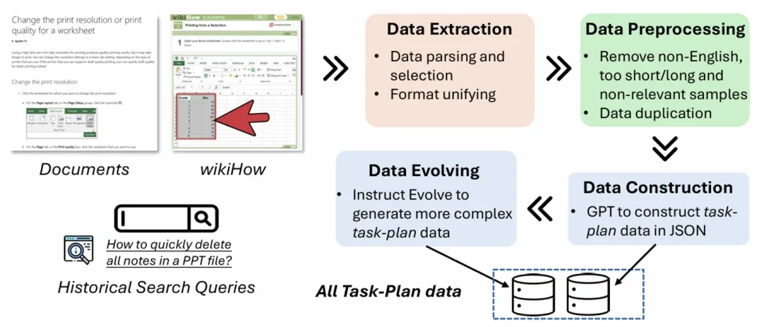 如图 2 所示,任务 – 计划数据以用户请求为起点,生成任务描述及其对应的详细操作步骤。该团队从多种开源资源中收集任务 – 计划对,包括应用帮助文档(如 Microsoft Word 的帮助页面)、WikiHow 任务教程,以及用户的搜索查询记录。