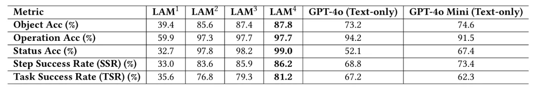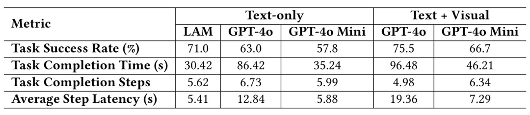 2. 平均步时延:LAM 的每步时延为 5.41 秒,显著优于无视觉输入的 GPT-4o(12.84 秒)和带视觉输入的 GPT-4o(19.36 秒)。