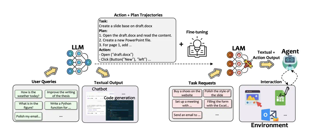 LAM 的开发需要从仅生成文本的 LLMs 转化为具备任务规划、动态执行和调整能力的模型。这不仅需要对模型架构进行深度改造,还需要采用全新的训练方法,以赋予模型行动生成与环境适配的能力。