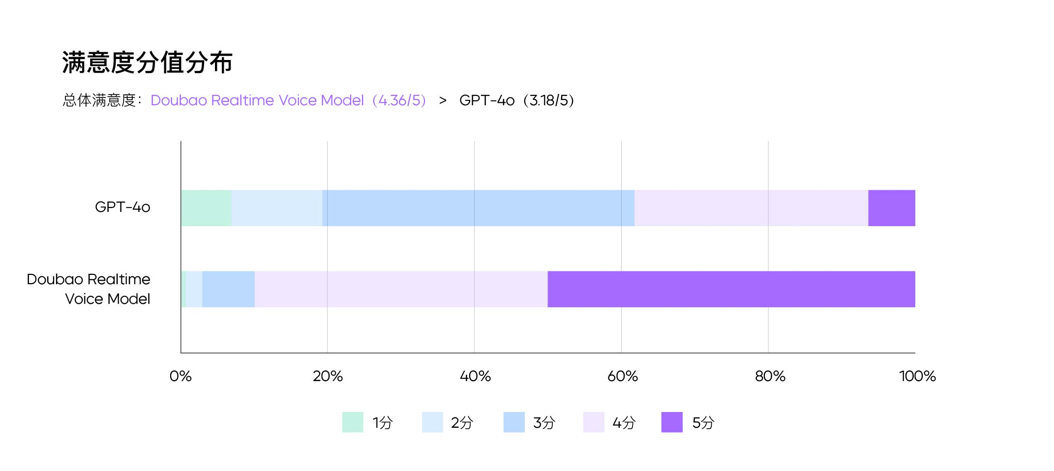 豆包全新实时语音通话功能与同类产品拉开明显差距,中文对话断崖式领先,同时,情商智商双双在线。据外部真实反馈,用户对豆包此次上线的全新语音通话功能整体满意度为4.36/5,对GPT-4o语音对话满意度则为3.18/5,尤其语音语气自然度和情绪饱满度方面,豆包有明显优势。