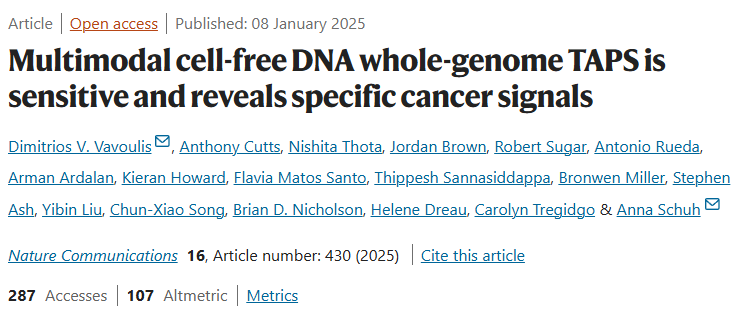 该研究以「Multimodal cell-free DNA whole-genome TAPS is sensitive and reveals specific cancer signals」为题,于 2025 年 1 月 8 日发布在《Nature Communications》。