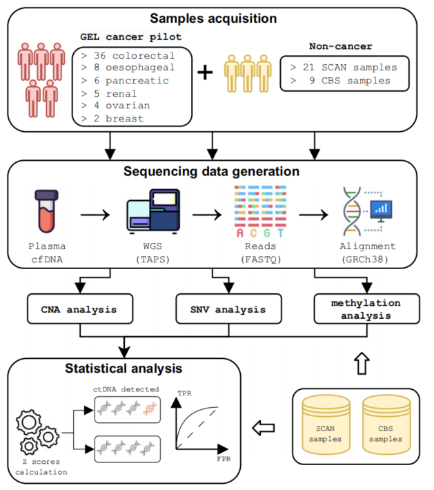 研究团队开发了一套多模态数据分析流程,整合了拷贝数变异(CNA)、体细胞突变和甲基化信号,以提高 ctDNA 检测的灵敏度。
