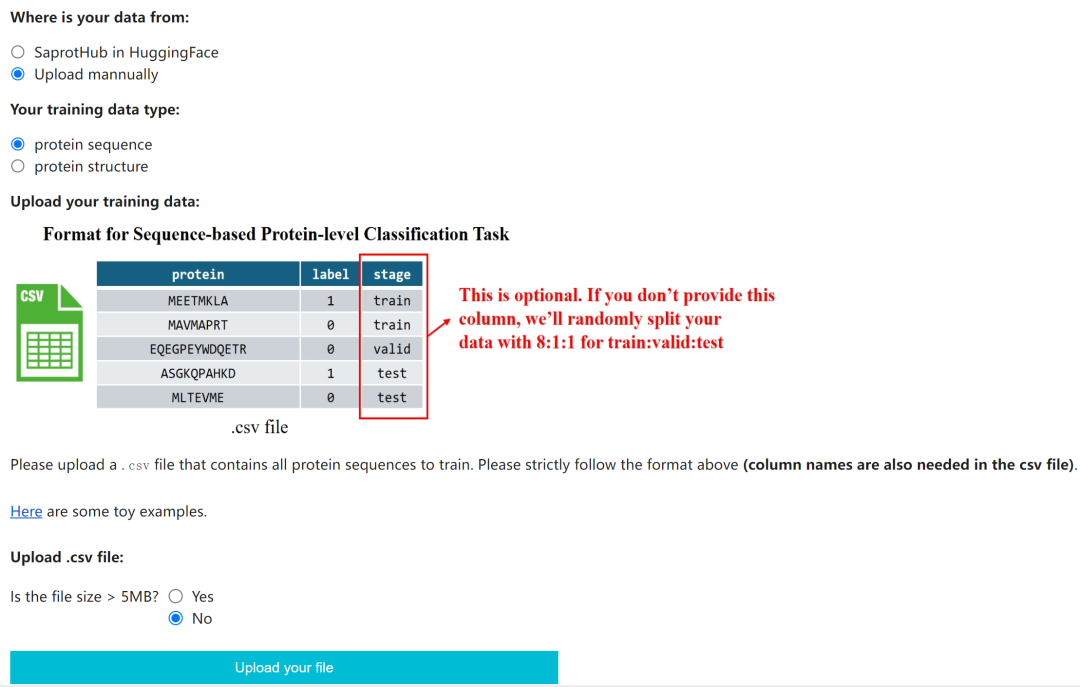 ColabSaprot 将训练模型所需的繁杂步骤全部进行了封装。用户只需要在交互界面中按照需求设定好目标训练任务,随后上传一个指定格式的数据集文件即可开始训练。