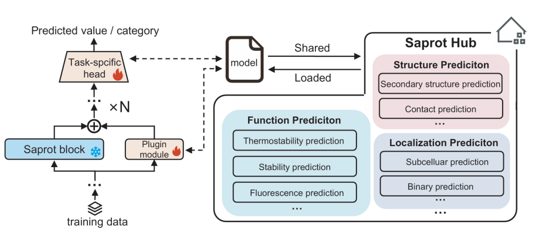 SaprotHub 包括三个核心部分:Saprot 模型、ColabSaprot 交互界面以及 HuggingFace 模型仓库。用户通过 ColabSaprot 来训练和使用 Saprot 模型,同时可以直接加载 HuggingFace 仓库中的模型来进行预测。