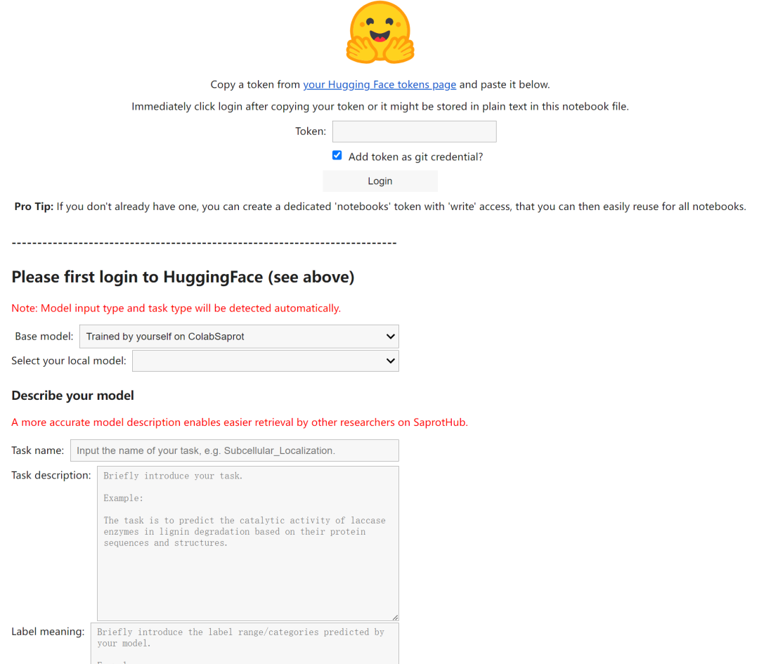 为了鼓励用户分享自己训练的模型,共同促进领域内的发展,ColabSaprot 集成了 HuggingFace 的模型上传功能,让用户可以无缝将自己训练完的模型上传到模型仓库中供他人使用,在促进社区发展的同时也能提高自身工作的影响力。