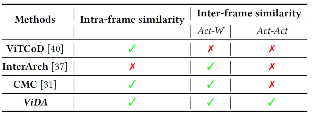 VDiT 采用多帧并行推理的方法生成视频,但由于帧间相似性,多帧激活计算中存在冗余。如图 2 所示,现有研究包括 ViTCoD [HPCA 2023], InterArch [DAC2024] 和 CMC [ASPLOS 2024] 主要利用帧内相似性,但帧间相似性仍未被充分利用。现有工作仅考虑对 Act-W 算子(如 QKV 投影和 O 投影)进行差分计算。然而,由于激活 – 激活(Act-Act)算子的非线性表达,VDiT 中的 Act-Act 算子(如 Logit 和 Attend)无法使用这些差分计算方法,VDiT 中仍有 56.97% 的计算无法通过现有差分计算方法加速。