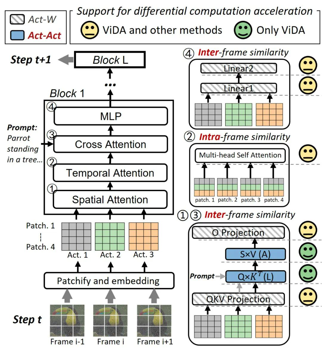 基于这一理念,ViDA 结合视频相似性预测的差分计算,提出了一套面向视频生成模型的优化方法。通过深度挖掘生成过程中的帧间激活相似性,ViDA 有效减少了计算冗余,为推理效率和硬件性能的全面提升奠定了基础。