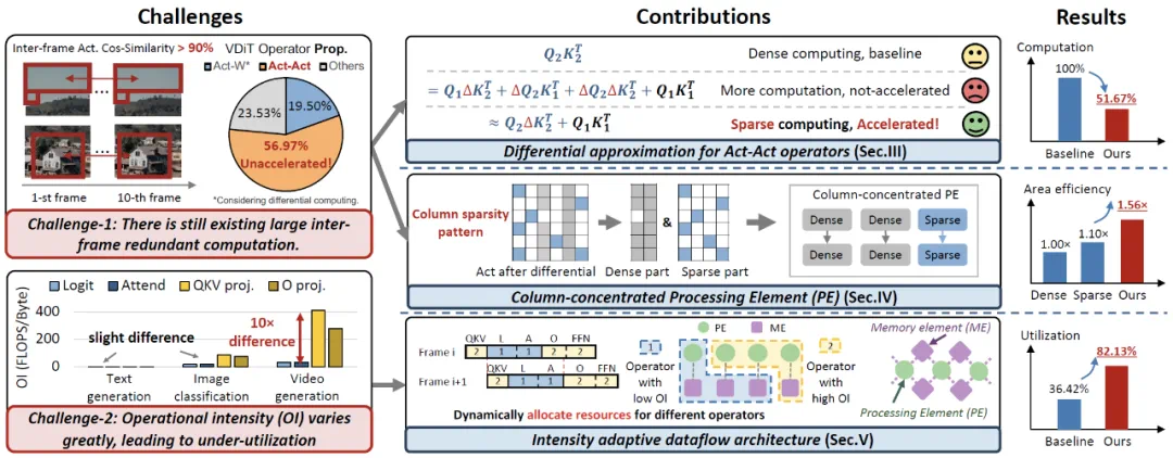 如何有效地加速视频生成模型的推理过程,不仅对模型性能的优化提出了更高的要求,也成为推动生成技术落地的重要瓶颈问题。这一背景下,针对特定生成任务设计高效的计算架构和优化算法成为当前的研究重点。以 OpenAI 的 Sora 为代表,视频扩散 Transformer(VDiT)模型的最新进展极大地推动了视频生成领域的发展。然而,VDiT 推理过程中仍然存在帧间计算冗余和算子计算强度差异较大的问题。现有基于有限帧间相似性的计算方法以及静态硬件架构和数据流设计,无法有效解决 VDiT 推理速度缓慢的瓶颈。为应对上述挑战,作者团队结合帧间预测的差分计算与帧内稀疏特性的分析,提出了视频生成模型的软硬一体加速器 ViDA,创造性地通过差分近似方法和自适应数据流架构,利用稀疏性实现软硬件协同优化,从而大幅提升了 VDiT 的推理性能。在多种主流 VDiT 模型上的实验结果表明,与 NVIDIA A100 GPU 和现有最先进加速器相比,ViDA 分别实现了平均 16.44 倍 / 2.18 倍的加速比和 18.39 倍 / 2.35 倍的面积效率提升。