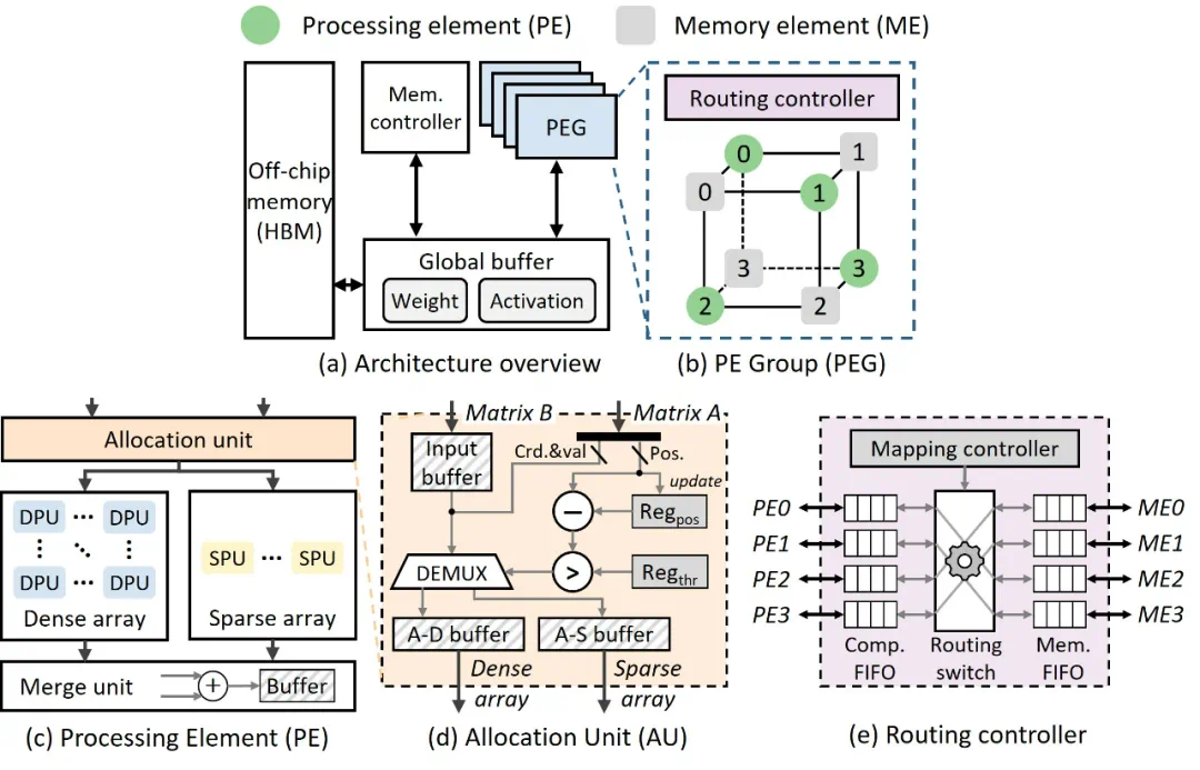 为支持强度自适应数据流优化,我们设计了一种可重配置硬件架构,其中路由控制器作为核心组件,用于动态调整处理单元(PE)与内存单元(ME)之间的数据路径(如图 6 (b) 和 6 (e) 所示)。路由控制器通过映射控制器动态分配资源,结合路由开关调整连接路径,并利用 FIFO 队列临时存储数据,以适应不同算子的资源需求。
