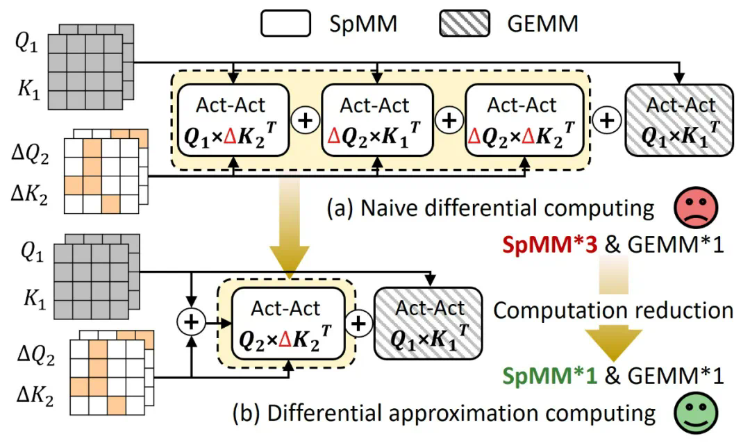 如图 5(a)所示,我们选取一个特定的激活作为参考激活,对冗余激活执行差分剪枝操作后,冗余激活的 Act-Act 计算可以拆解为 4 个部分,需要进行三次稀疏矩阵 – 矩阵乘法(SpMM)计算,不能实现计算效率提升。