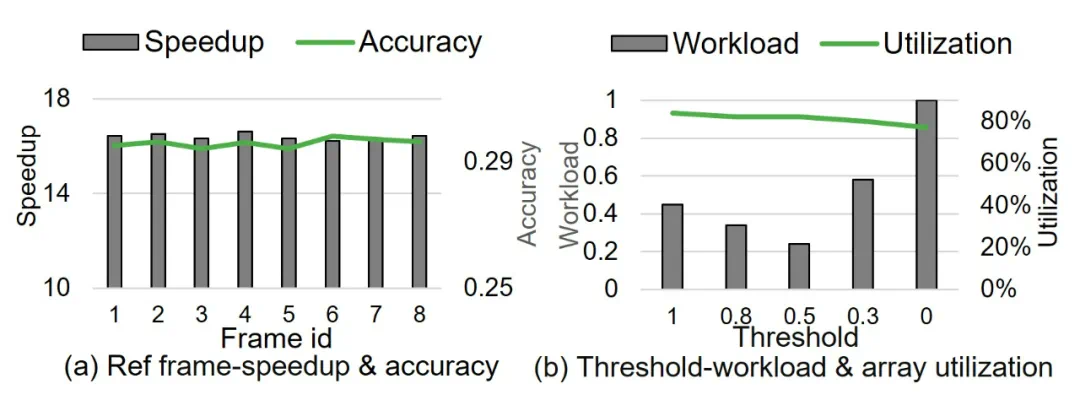 如图 9 (b) 所示,我们分析了不同分配阈值对处理单元数组负载和利用率的影响。结果表明,当阈值设为 50% 时,可以实现最低的负载和最高的硬件利用率。
