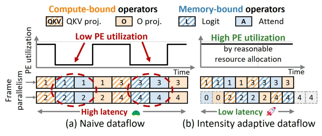资源平衡:针对注意力计算中计算强度差异大(如图 7 (a)),对 Logit 和 Attend 操作优化内存访问压力,对 QKV 和 O 投影操作优化计算密集度,提升处理单元(PE)和内存带宽的利用率。