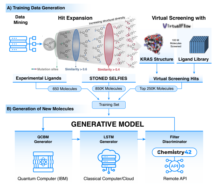 在这项研究中,为了生成潜在新型KRAS抑制剂,研究人员提出了一种由量子变分生成模型(QCBM)和长短期记忆网络(LSTM)相结合的量子-经典混合框架模型,将量子计算与经典计算方法结合起来设计新分子。他们首先利用一个包含110万种分子的定制数据集对混合模型进行训练,其中包括650种从文献中获得的先前经实验验证可阻断KRAS的分子,使用 STONED-SELFIES 算法参考现有KRAS抑制剂生成85万种类似物、以及通过开源超大型虚拟筛选平台VirtualFlow获得的25万种分子数据,这些训练帮助优化了该综合模型。
