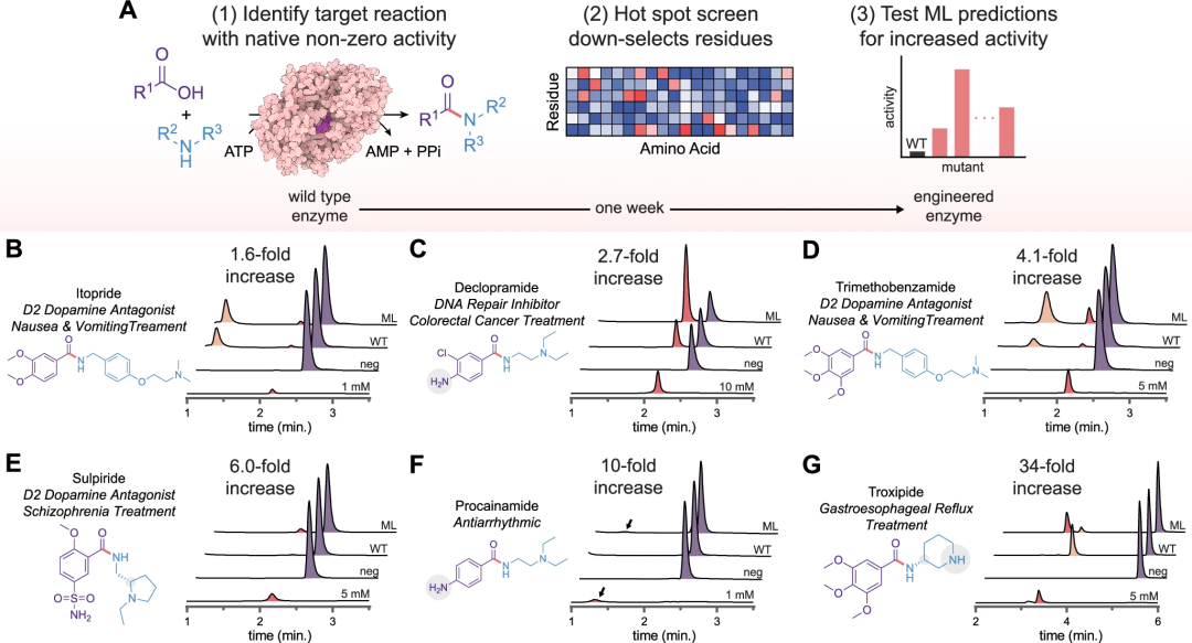 他们利用该平台对 10,953 个独特反应中的 1217 种酶变体的底物偏好进行评估,从而设计出酰胺合成酶。