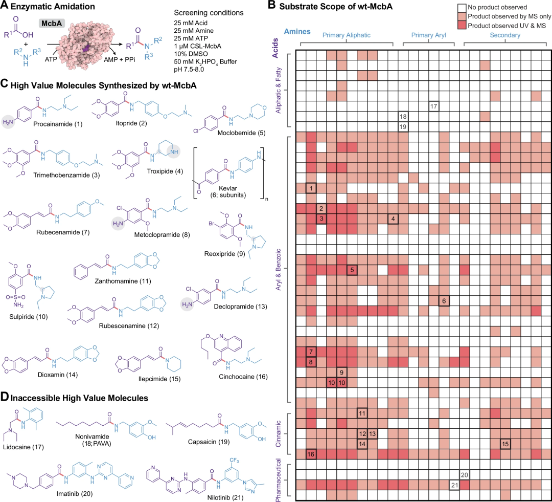 McbA 是一种代表性的 ATP 依赖性酰胺键合成酶,参与了 marinacarboline 次级代谢物的生物合成。McbA 及其同源蛋白 ShABS35 已被证实具有较宽的底物范围,可以接受药物中常见的几种简单酸和胺。