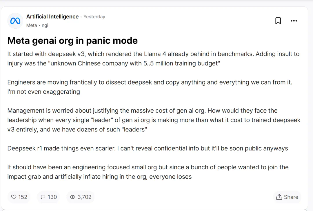 这一切始于 DeepSeek-V3,它在基准测试中就已经让 Llama 4 落后。更糟糕的是那个「拥有 550 万训练预算的不知名中国公司」。 工程师们正在疯狂地分析 DeepSeek,试图从中复制任何可能的东西。这一点都不夸张。 管理层担心如何证明庞大的生成式 AI 组织的成本是合理的。当生成式 AI 组织中的每个「领导」的薪资都比训练整个 DeepSeek-V3 的成本还要高,而我们有好几十个这样的「领导」时,他们要如何面对高层?