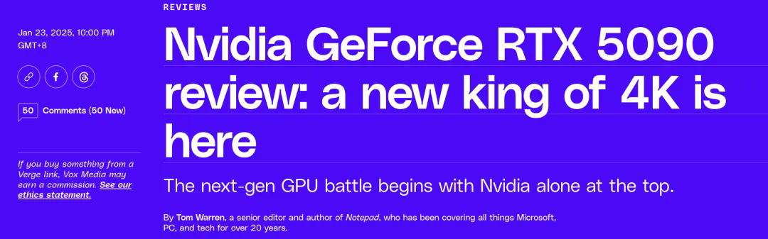 文章来源于互联网:英伟达RTX 5090评测解禁,天赋都点在了 AI 上