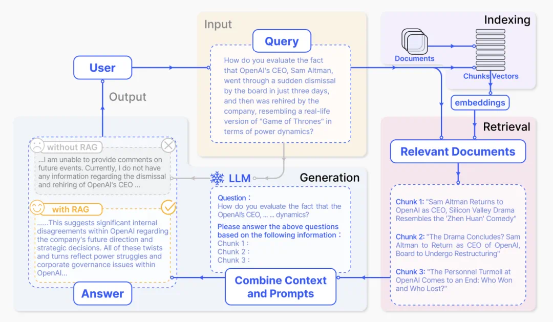 在这个示例中,用户先向大模型提出一个涉及当时最新新闻的问题,而这个新闻自然不可能出现在该大模型之前的预训练数据中。于是,RAG 就可以填补上这个空白 —— 收集与该用户查询相关的新闻文章,再将这些文章与原始问题一起组合成一个全面的提示词提供给大模型;这样一来,大模型便可以基于丰富的信息生成答案了。