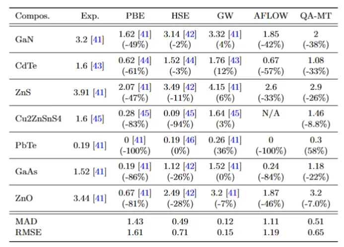 在这些方法中,QA-MT 在 MAD(0.51)和 RMSE(0.69)的优异表现,与 HSE 接近,显著优于 PBE 和 AFLOW。