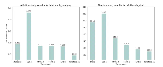 尽管合成数据在某些方面对模型有帮助,实验结果显示,引入真实的领域知识(如 matbench 数据集)是性能显著提升的关键。