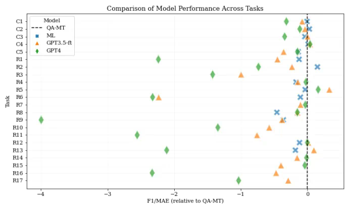 图 3:模型性能与 QA-MT 在各项任务中的比较。