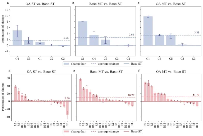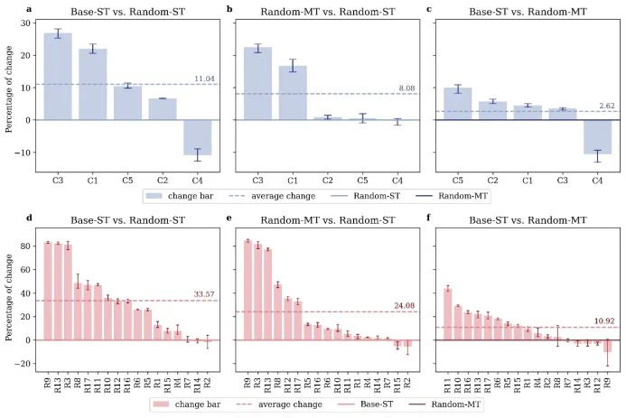 图 2 中,以 Base-ST 为基准,柱状图显示了不同模型在特定任务上的差异。虚线表示平均改进。