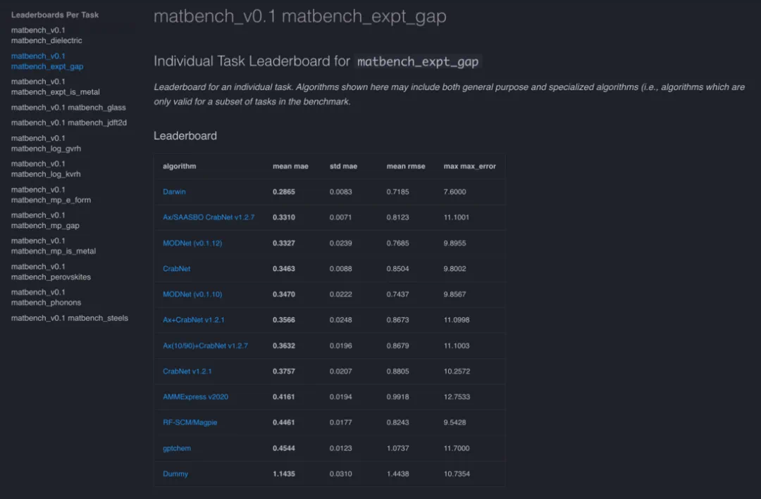 图示:DARWIN 登顶劳伦斯伯克利国家实验室 MatBench 材料带隙实验性质的预测的最高记录。