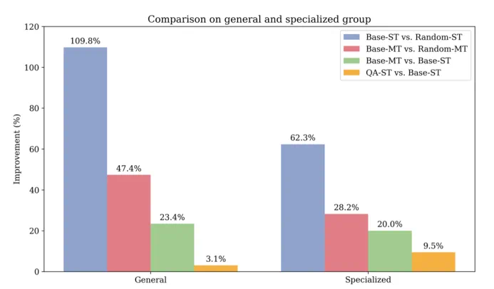 - 微调策略:分别对两种模型进行单任务微调(Random-ST/Base-ST)和多任务微调(Random-MT/Base-MT)。