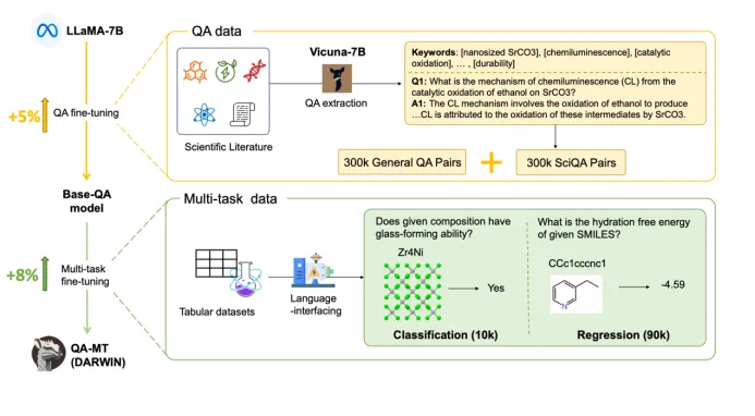 在该研究中,团队设计了一个两阶段训练策略,即 QA(question-answering)微调和多任务学习,以赋予 DARWIN 熟练执行这些任务的能力。