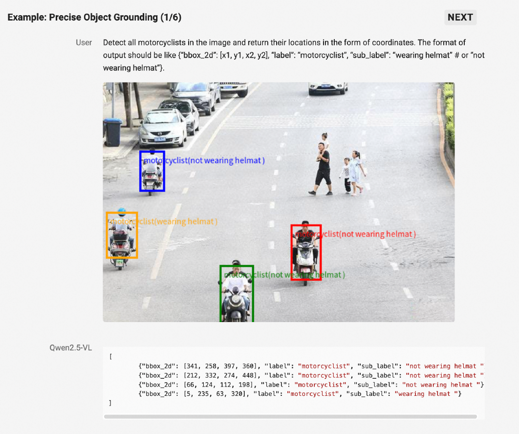 新的Qwen2.5-VL视觉知识解析能力实现了巨大飞跃:不仅能准确识别万物,还能解析图像的布局结构及其中的文本、图表、图标等复杂内容,从一张app截图中就能分析出插图和可点按钮等元素;可精准定位视觉元素,拥有强大的关键信息抽取能力,比如准确识别和定位马路上骑摩托车未戴头盔的人,或是以多种格式提取发票中的核心信息并做结构化的推理输出;OCR能力提升到全新水平,更擅长理解图表并拥有更全面的文档解析能力,在精准识别的内容同时还能完美还原文档版面和格式。