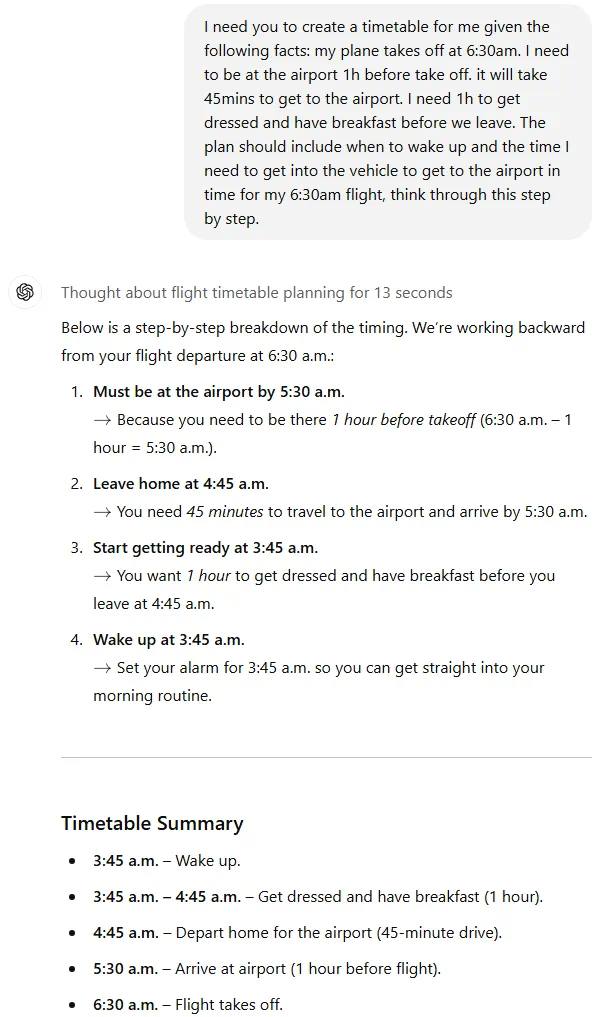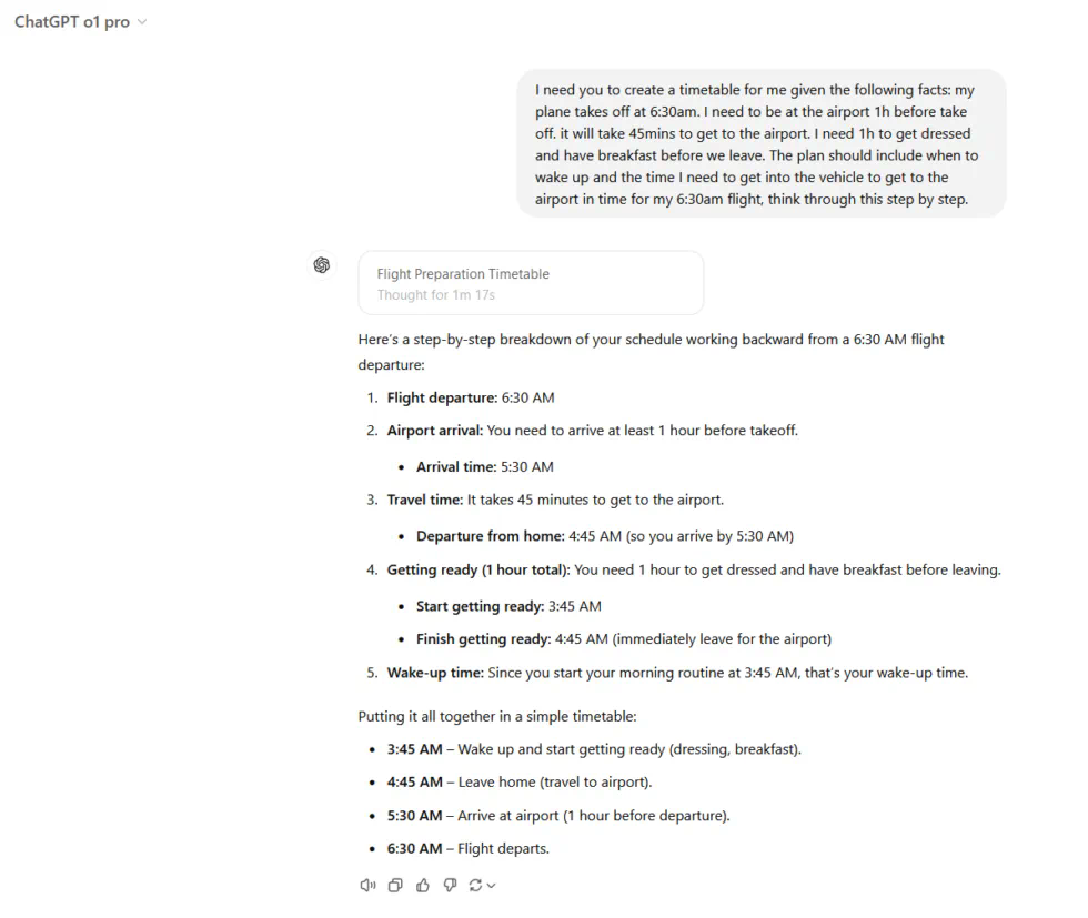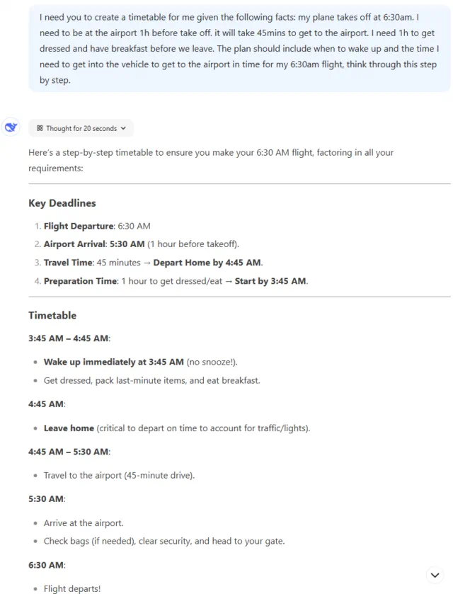 比拼结果:三款模型都算对了基础时间 —— 要想赶上 6:30 的航班,得凌晨 3:45 起床(反人类的早啊!)。不过细节见真章:ChatGPT o1 抢跑成功,生成答案比 DeepSeek R1 快 7 秒(比自家 o1 Pro 的 77 秒更是快出天际),如果用性能更强的 o1 Mini 估计还能更快。