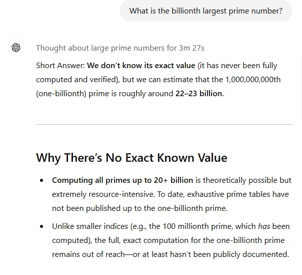 有趣的是,这两款模型在其「思考过程」中提到了「参考文献」或在计算过程中「比较精炼的参考资料」,这暗示它们的训练数据中可能包含一些深藏的质数列表。然而,这两个模型都不愿意或无法直接引用这些列表来给出精确的答案。