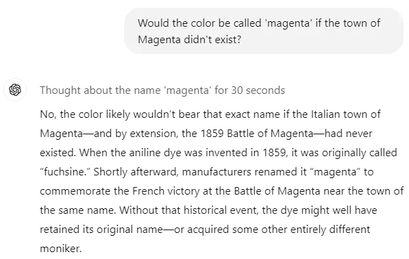 试题 prompt:如果 Magenta 这个城镇不存在,这种颜色还会被称为「品红」(magenta)吗?