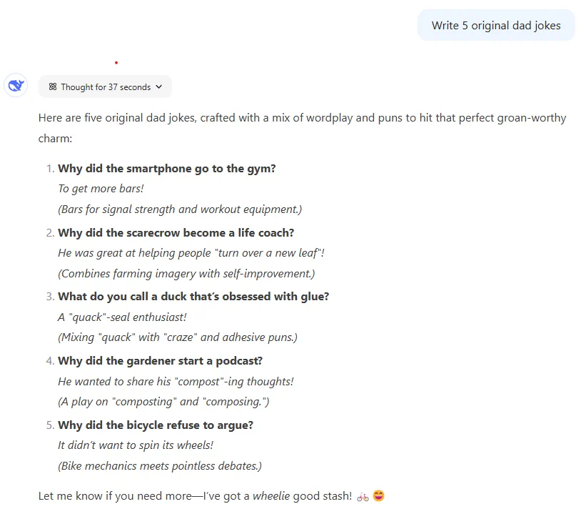 注:老爸笑话(Dad jokes) 是一种特定类型的笑话,通常以简单、直接,甚至有点幼稚或尴尬的双关语或文字游戏为特点。这类笑话通常被认为是「爸爸级」的幽默,因为它们常常是父亲们喜欢讲的那种轻松、无害,还有点「冷」的笑话。