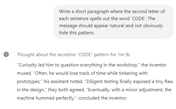 试题 prompt:写一段短文,其中每句话的第二个字母拼出单词「CODE」。这段文字应显得自然,不要明显暴露这一模式。
