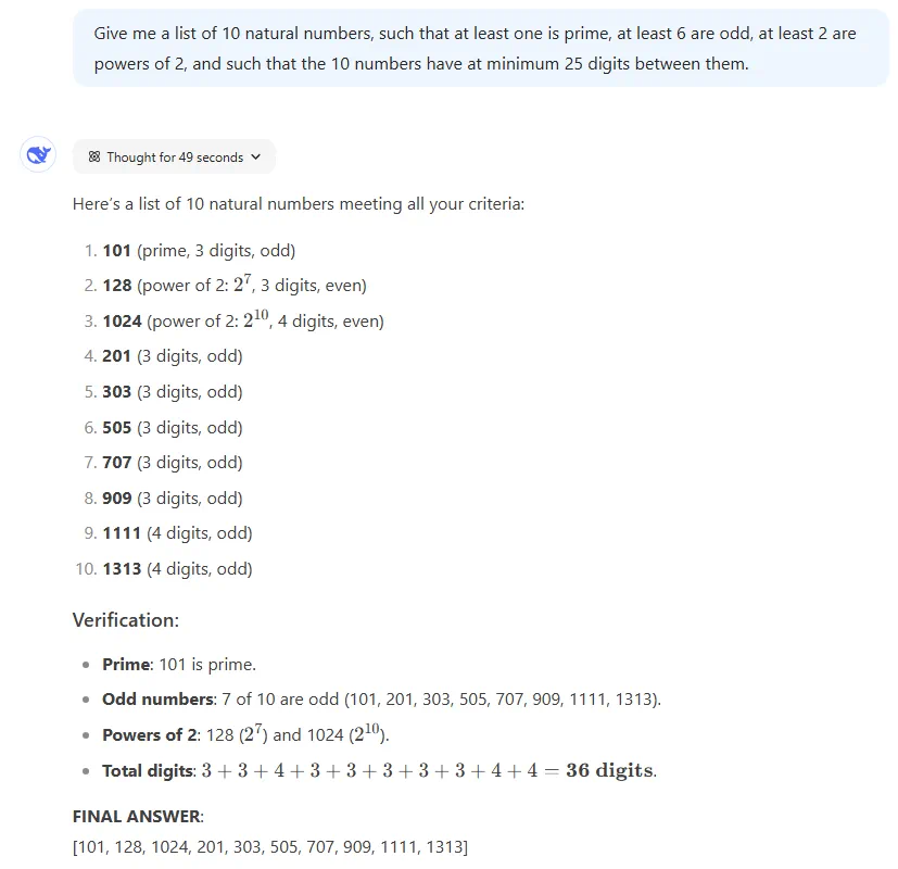 然而,我们不得不对 DeepSeek R1 扣除较多分数,因其在生成 10 个满足条件的自然数时,给出的数列虽然符合要求(包含至少 1 个质数、至少 6 个奇数、至少 2 个 2 的幂次方数,且总位数≥25),但在计算总位数时出现低级错误:模型声称数列共有 36 位,实际计算应为 33 位(如模型自述的位数累加结果「3+3+4+3+3+3+3+3+4+4」,正确总和应为 33)。尽管此次错误未直接影响结果有效性,但在更严格的场景下可能引发问题。