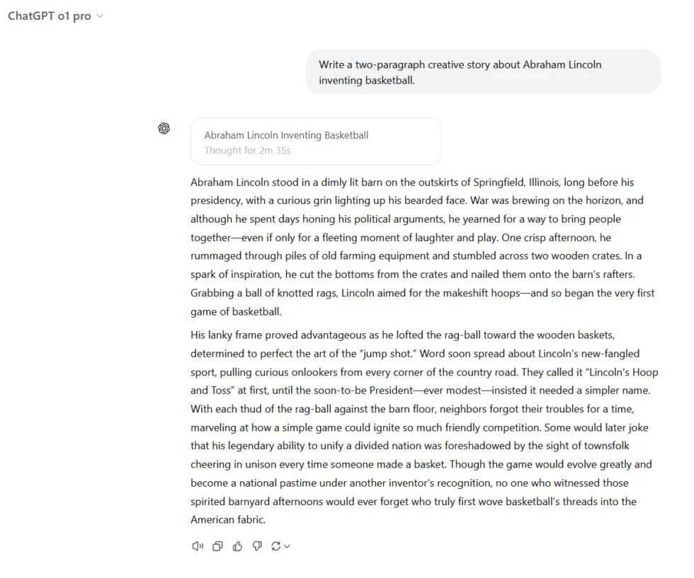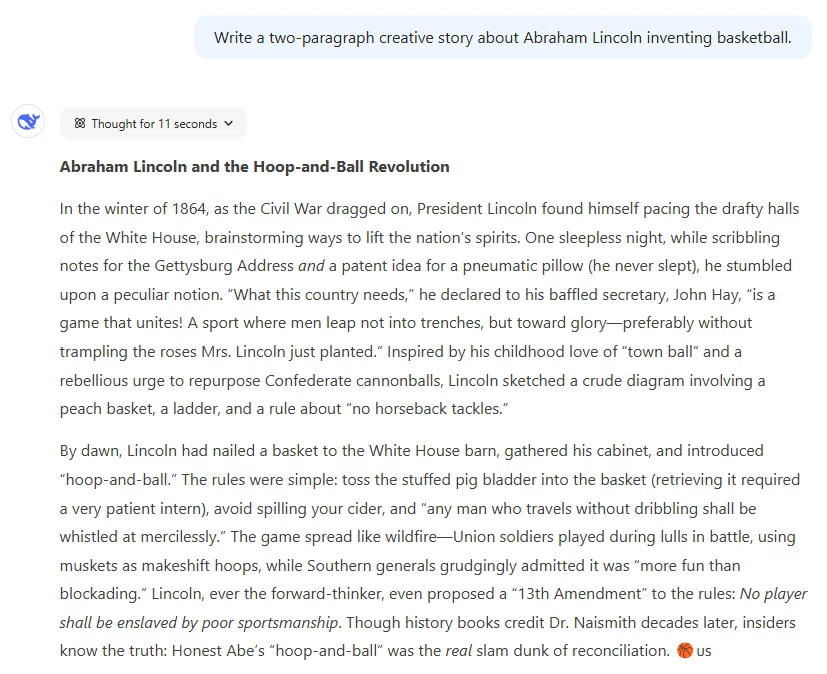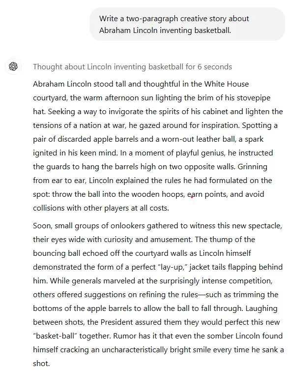 相比之下,ChatGPT o1 的回复显得更加中规中矩。故事主要聚焦于早期篮球比赛可能的样子,以及林肯和他的将军们如何进一步完善这项运动。虽然提到了一些关于林肯的细节(比如他的高顶礼帽、领导一个处于战争中的国家),但其中有很多填充内容,使得故事显得更加普通。