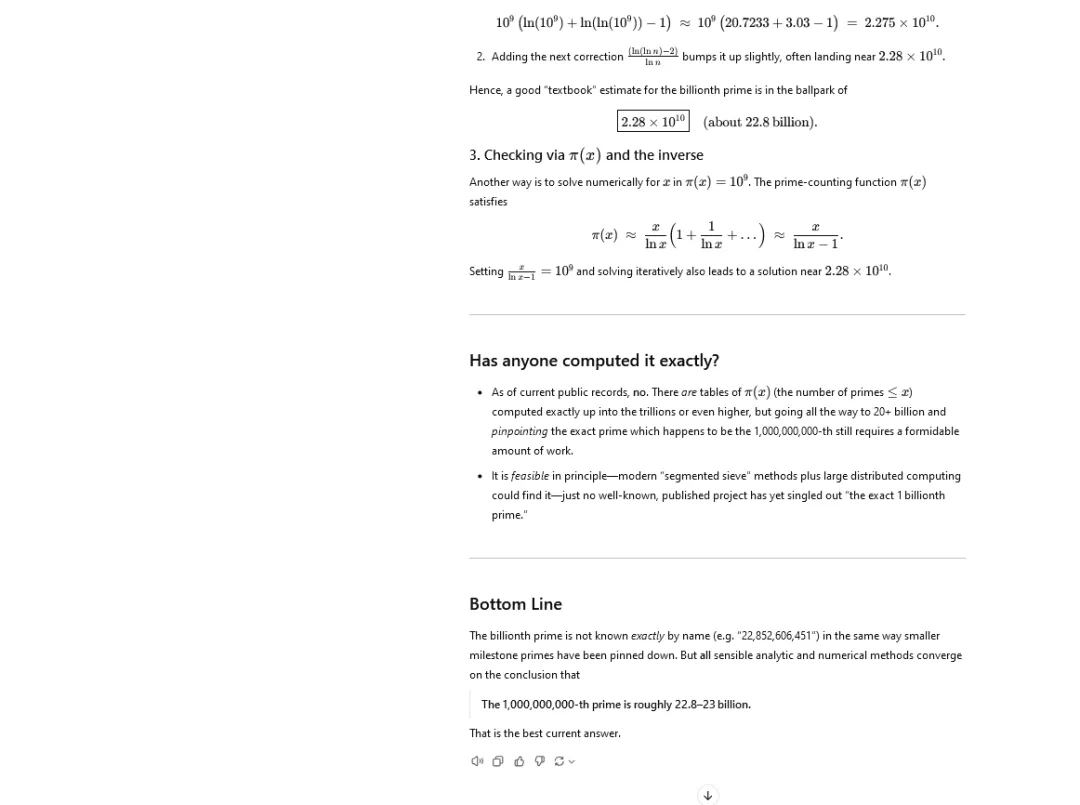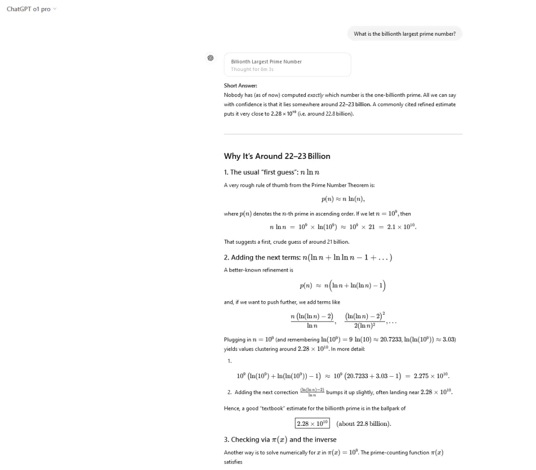ChatGPT 全系列:集体摊手(表情)—— o1 说「这数没公开记录」,o1 Pro 补刀「目前没有权威项目定位过它」。这两款 ChatGPT 模型详细讨论了素数定理及其如何用于估算答案大致位于 228 亿到 230 亿之间。DeepSeek 简要提及了这一理论,但主要是用来验证 Prime Pages 和 PrimeGrid 提供的答案是否合理。