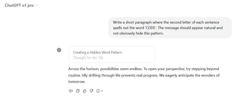 ChatGPT o1 也犯了与 DeepSeek 相同的错误,使用了每句话的第一个字母而非第二个字母,尽管其「思考细节」中声称它「确保字母顺序」并「确保对齐」。ChatGPT o1 Pro 是唯一一个似乎理解了任务的模型,经过四分钟的思考后,精心设计了一段类似俳句的回复,并正确嵌入了「CODE」一词。