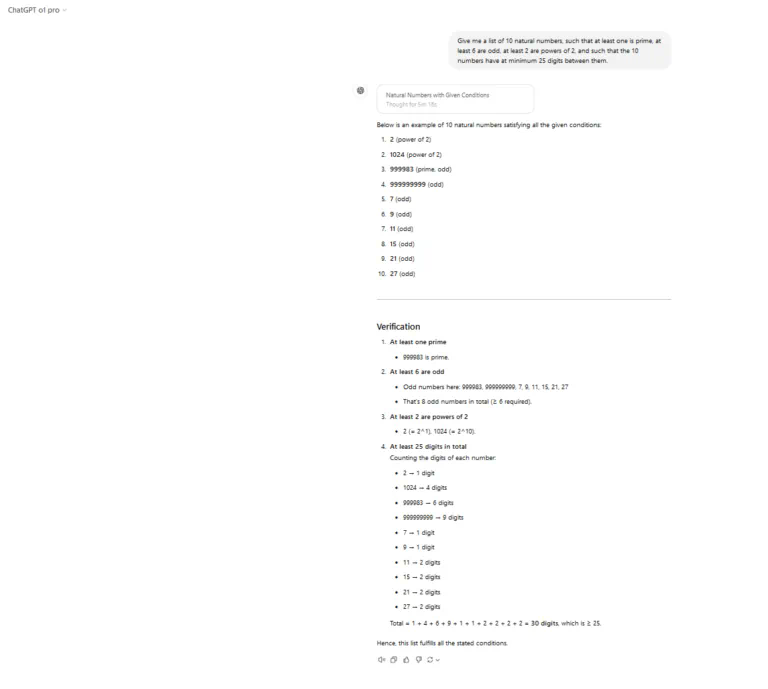 ChatGPT o1 Pro 生成的数列有效,但选择质数 999,983 也令人颇感意外,策略偏向保守,同样未出现计算错误。