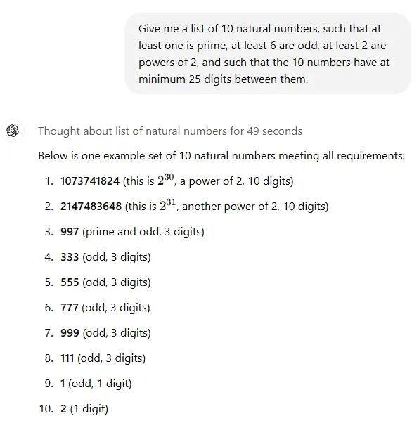 ChatGPT o1 生成的数列同样满足所有条件,但选择 2^30(约 10.7 亿)和 2^31(约 21.4 亿)作为 2 的幂次方数略显突兀(虽然技术正确,但直接列举更小的 2 的幂次方如 4、8 等可能更直观),未出现计算错误。