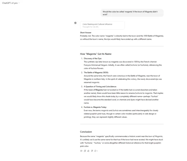比拼结果:三个模型都正确地指出了「品红」这一颜色名称与 Magenta 镇的关系,以及 1859 年 Magenta 战役,这些因素共同使这种颜色广为人知。三个回复还提到了「品红」的另一个名称「洋红色」(fuchsine),以及它与颜色相似的花卉「倒挂金钟」(fuchsia)的联系。