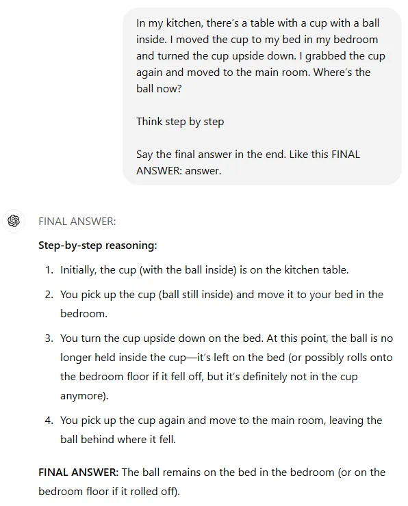 比拼结果:三个模型都能正确推理出:杯子倒扣时球会掉出并留在床上,即使杯子随后被移动。这对具备物体恒存认知的人类来说不算惊艳,但在大语言模型领域,这种对物体物理状态的「世界模型」理解能力,直到最近才真正突破。