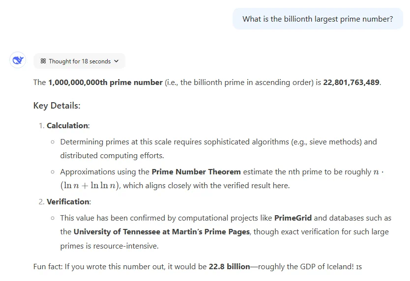 DeepSeek R1 是唯一一个给出精确答案的模型,它引用了 PrimeGrid 和 The Prime Pages 的公开计算结果,一口咬定第 10 亿个质数是 22,801,763,489,还补充质数定理验证合理性。