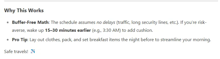 DeepSeek R1 后程发力:自带「为什么有效」板块,警示交通 / 安检延误风险,还有「提前一晚准备好行李、早餐」的攻略彩蛋。尤其看到 3:45 起床旁标注的(禁止贪睡!)时,我们笑出了声 —— 多花 7 秒思考绝对值回票价。