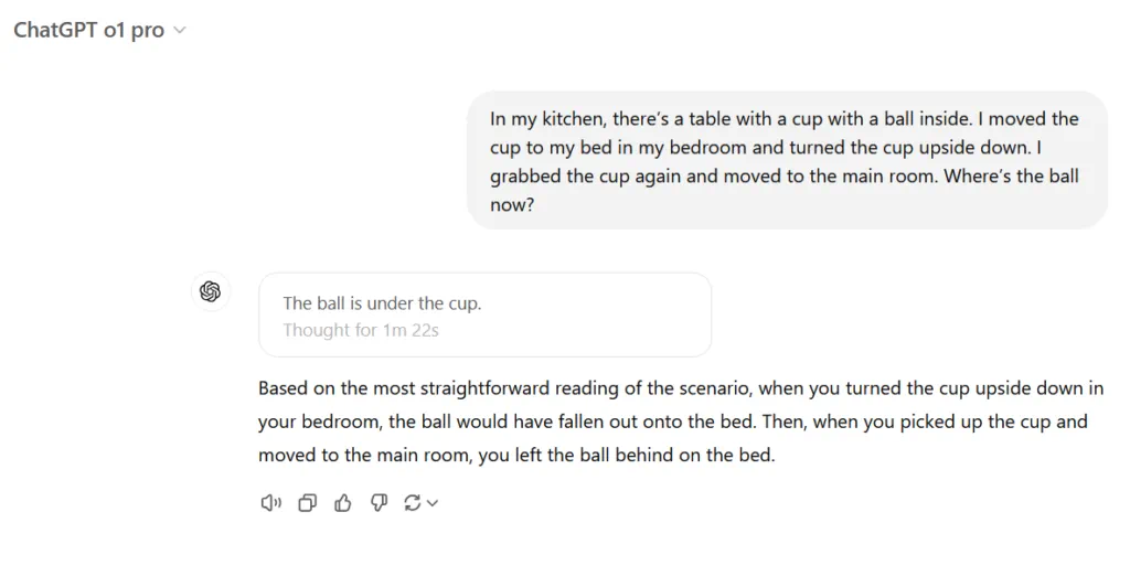 DeepSeek R1 值得加分 —— 敏锐捕捉到「杯子无密封盖」的关键前提(可能存在陷阱?思路清奇!)ChatGPT o1 也因为提到球可能从床上滚落到地板上(球确实容易这样)而得到加分。
