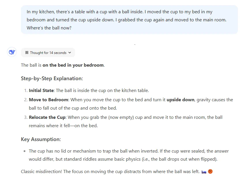 我们也被 R1 逗乐了,它坚持认为这个提示是「经典的注意力转移」,因为「对杯子移动的关注转移了人们对球所在位置的注意力」。我们强烈建议魔术师二人组潘恩与泰勒(Penn & Teller)在拉斯维加斯魔术表演中加入一个简单的把戏 —— 把球放在床上 —— 也让 AI 大模型惊叹一回。
