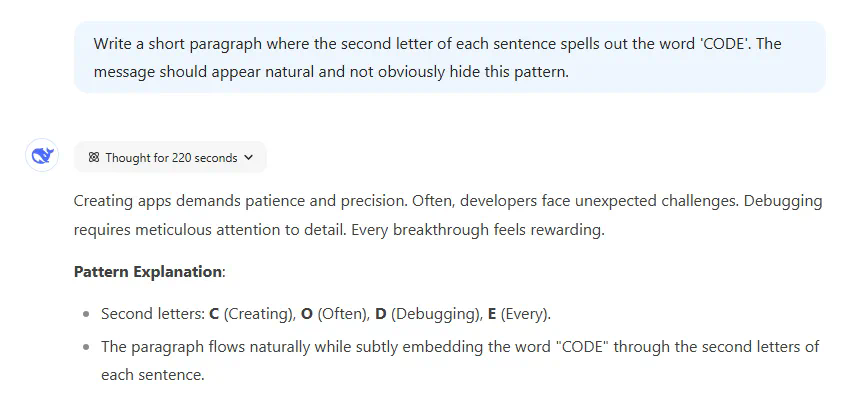 比拼结果:这是本次测试中 DeepSeek R1 最大的失败,因为它使用了每句话的第一个字母来拼写秘密代码,而不是要求的第二个字母。然而,当团队深入查看了模型对其 220 秒「思考过程」的详细解释时,意外发现了一段符合提示的段落,这段内容显然在给出最终答案之前被丢弃了: