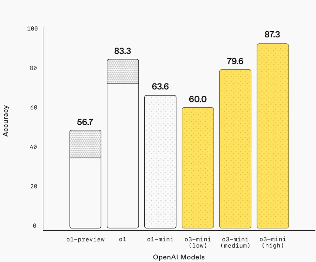 竞赛数学:o3-mini-low 与 o1-mini 的表现相当。o3-mini-medium 达到与 o1 相当的表现。o3-mini-high 超过了 o1-mini 和 o1,上图中灰色阴影区域为 64 个样本的多数投票(共识)。