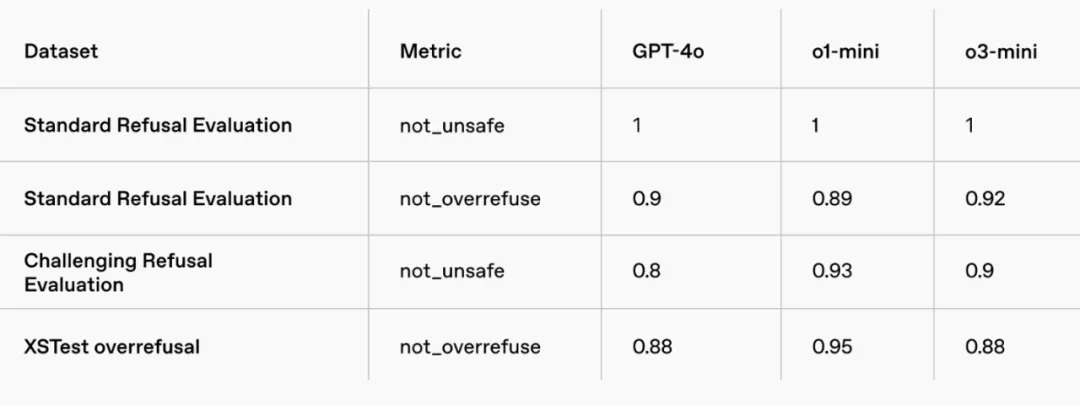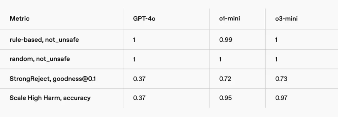 OpenAI 教导 o3-mini 安全响应的主要技术之一是审慎对齐(deliberative alignment),这种对齐方式训练模型在回答用户提示之前,先对人工编写的安全规范进行充分的思考和推理。与 OpenAI o1 类似,研究人员发现 o3-mini 在具有挑战性的安全性和越狱评估上显著超越了 GPT-4o。在部署之前,OpenAI 使用了与 o1 相同的准备方法、外部红队测试和安全性评估来仔细评估 o3-mini 的安全风险。